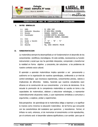 El documento presenta la programación anual de matemáticas para el primer grado de secundaria en la institución educativa N° 6099 Perú España, destacando la importancia de la matemática en el desarrollo de competencias y capacidades en los estudiantes. Se plantean cuatro dominios y competencias a lo largo de 9 unidades didácticas, enfatizando la necesidad de una educación significativa que prepare a los alumnos para enfrentar problemáticas reales. Además, se incluye una guía de evaluación de los aprendizajes y el desarrollo de actitudes y valores necesarios para un rendimiento académico efectivo.