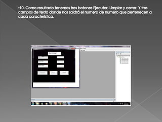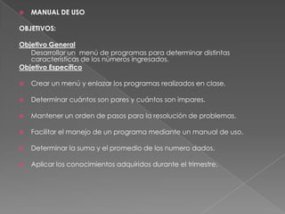 El documento presenta un manual de uso para un menú de programas que determina características de números ingresados. El objetivo general es desarrollar este menú usando Visual Basic para clasificar números como pares e impares, calcular suma y promedio, y aplicar conocimientos adquiridos en el trimestre. El manual guía al usuario a instalar Visual Basic 6.0, crear un proyecto con 5 formularios enlazados, y programar opciones en el menú principal para realizar diferentes cálculos sobre los números.