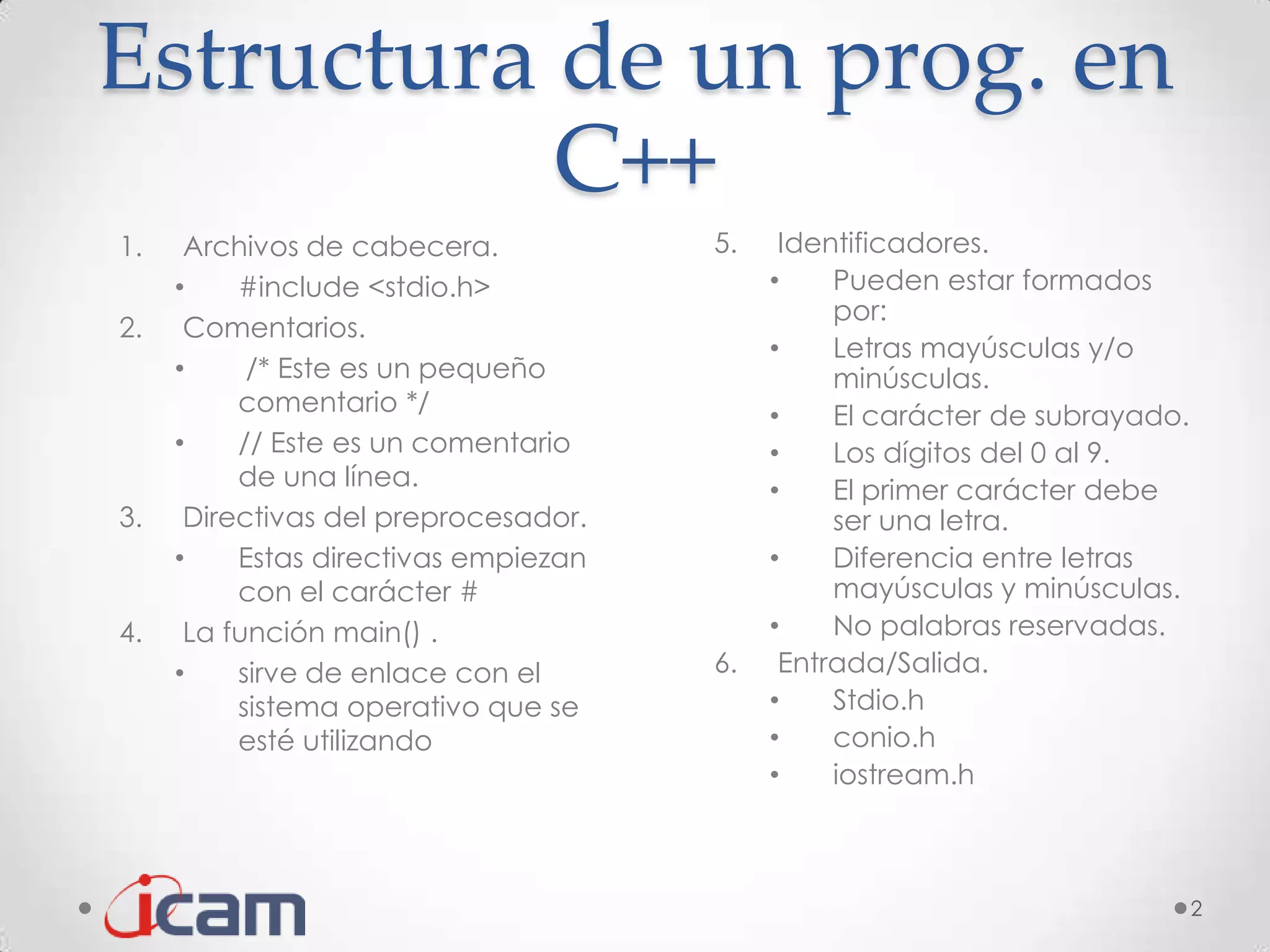 Este documento describe la estructura básica de un programa en C++, incluyendo secciones sobre archivos de cabecera, comentarios, directivas de preprocesador, la función main(), identificadores, entrada/salida mediante funciones como printf() y scanf(), variables y constantes, operadores, condicionales if-else y switch, bucles como for y while, y funciones. El documento ofrece una introducción general a los conceptos fundamentales de la programación en C++.