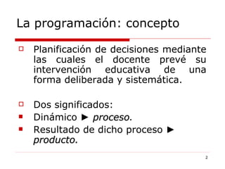 El documento habla sobre la programación por competencias en educación secundaria. Explica que la programación implica la planificación de la intervención educativa del docente de forma deliberada y sistemática. Define el currículo como el conjunto de objetivos, contenidos y metodologías que se trabajan en la escuela. Señala que los elementos básicos de la programación son los objetivos, competencias básicas, contenidos, metodología, atención a la diversidad y evaluación.
