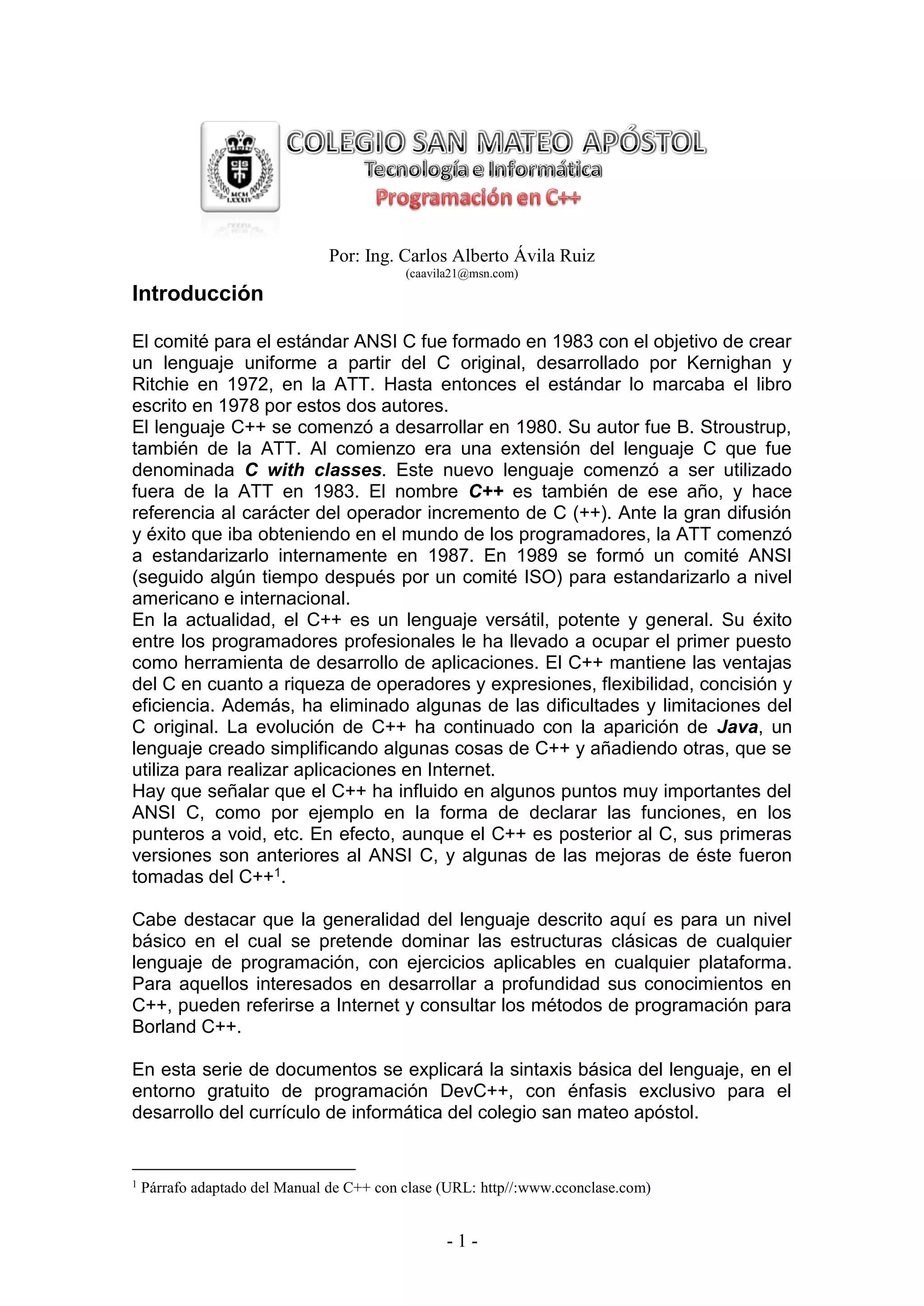 Este documento describe la historia y evolución de los lenguajes de programación C y C++. Explica que C fue creado en los años 70 y estandarizado por ANSI en 1983, mientras que C++ fue desarrollado en los años 80 como una extensión de C que agregó características de orientación a objetos. También describe las principales características y usos de C++ y cómo ha influido en otros lenguajes como Java.