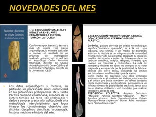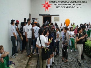 Este documento presenta la programación cultural del Museo Arqueológico La Merced para el mes de enero de 2012, incluyendo exposiciones temporales sobre cerámica precolombina, proyecciones de documentales sobre artesanías tradicionales, talleres para niños, y visitas guiadas al museo.