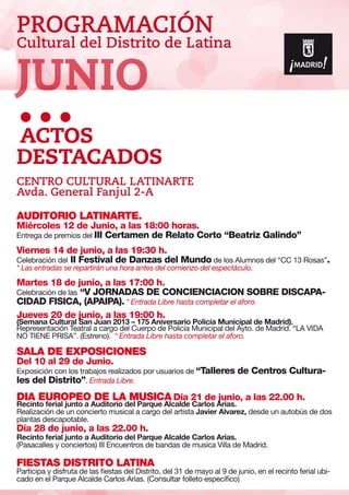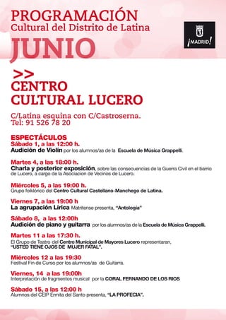 El documento presenta la programación cultural del Distrito de Latina para el mes de junio, incluyendo espectáculos, exposiciones y eventos en diferentes centros culturales del distrito. Se destacan conciertos musicales, obras de teatro, exhibiciones de danza y artes plásticas realizadas por alumnos de los centros. También se anuncia la campaña de la renta que tendrá lugar en uno de los centros culturales.