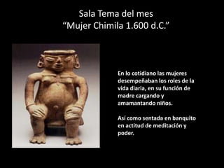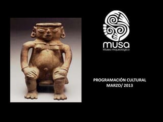 Este documento presenta la programación cultural y actividades para el mes de marzo en el Museo Arqueológico Casa del Marqués de San Jorge en Bogotá. Incluye exposiciones sobre la cultura chimila y pueblos indígenas en riesgo, documentales sobre comunidades indígenas, talleres que recrean la mitología de la mujer en culturas indígenas, visitas familiares los sábados, y servicios del museo.