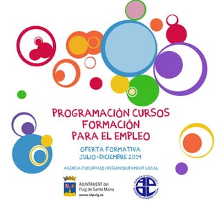 El documento detalla la oferta de cursos de formación para el empleo en El Puig de Santa María entre julio y diciembre de 2014, incluyendo requisitos para la subvención, fechas de inscripción y diversos cursos gratuitos y de pago. Se ofrecen talleres y cursos en áreas como idiomas, informática y atención sociosanitaria, con opciones de subvención para mejorar la accesibilidad. Se menciona también la posibilidad de participar en programas de voluntariado europeo para jóvenes de entre 18 y 30 años.