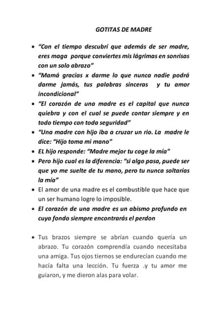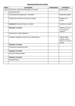 El documento presenta la programación para un día de la madre, con actividades como una bienvenida, oración, presentación sobre las madres, canto, compartir bocaditos y mensajes para las madres. A lo largo de la mañana se realizarán presentaciones sobre confección textil, artesanía y manualidades, con el objetivo de homenajear a las madres. El documento también incluye varias citas y reflexiones sobre el amor y el apoyo incondicional de una madre.