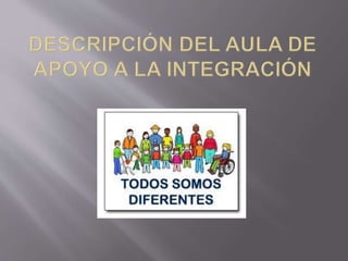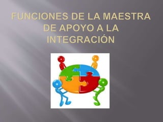 El documento describe las funciones y responsabilidades de un profesor de apoyo a la integración, incluyendo la elaboración de programas adaptados, la coordinación con otros profesionales, el apoyo a alumnos con necesidades específicas y sus familias, y la evaluación del progreso de los estudiantes.