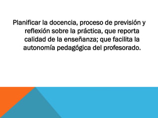 El documento describe la importancia de planificar la enseñanza mediante la previsión y reflexión sobre la práctica docente. Esto permite mejorar la calidad de la enseñanza y facilita la autonomía pedagógica del profesorado. La programación implica reflexionar sobre aspectos como los objetivos, métodos, secuencias y razones de las tareas, de forma contextualizada e intencional. Se proporcionan notas características de una programación flexible y posibles estrategias para planificar una unidad, como partir de un eje central, clarificar