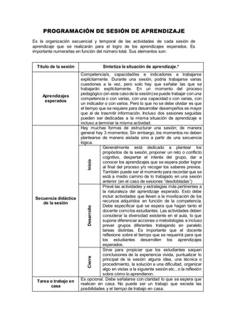 La programación de sesión de aprendizaje describe la organización secuencial y temporal de las actividades de cada sesión. Incluye el título de la sesión, los aprendizajes esperados, la secuencia didáctica con tres momentos (inicio, desarrollo y cierre), una posible tarea para casa, y planes de evaluación formativa y sumativa. La secuencia didáctica detalla las actividades y estrategias que el docente y estudiantes realizarán para lograr los objetivos de aprendizaje de la sesión.