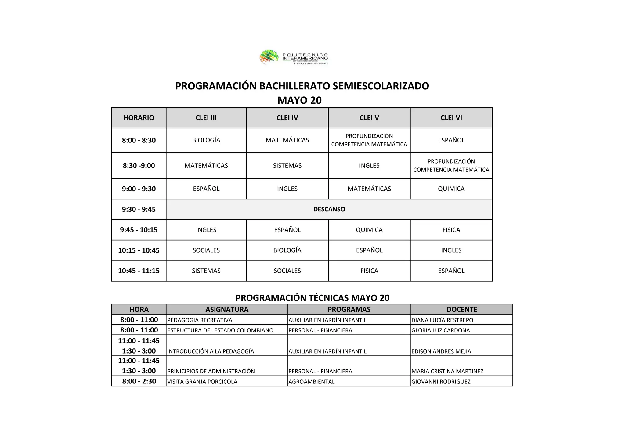 El documento presenta los horarios de las asignaturas para el bachillerato semiescolarizado en mayo. En la mañana se imparten asignaturas como biología, matemáticas, español, inglés, química, física y sociales. Por la tarde se detalla la programación de técnicas con asignaturas como pedagogía recreativa, estructura del estado colombiano e introducción a la pedagogía. Finalmente se incluye una visita a una granja porcícola.