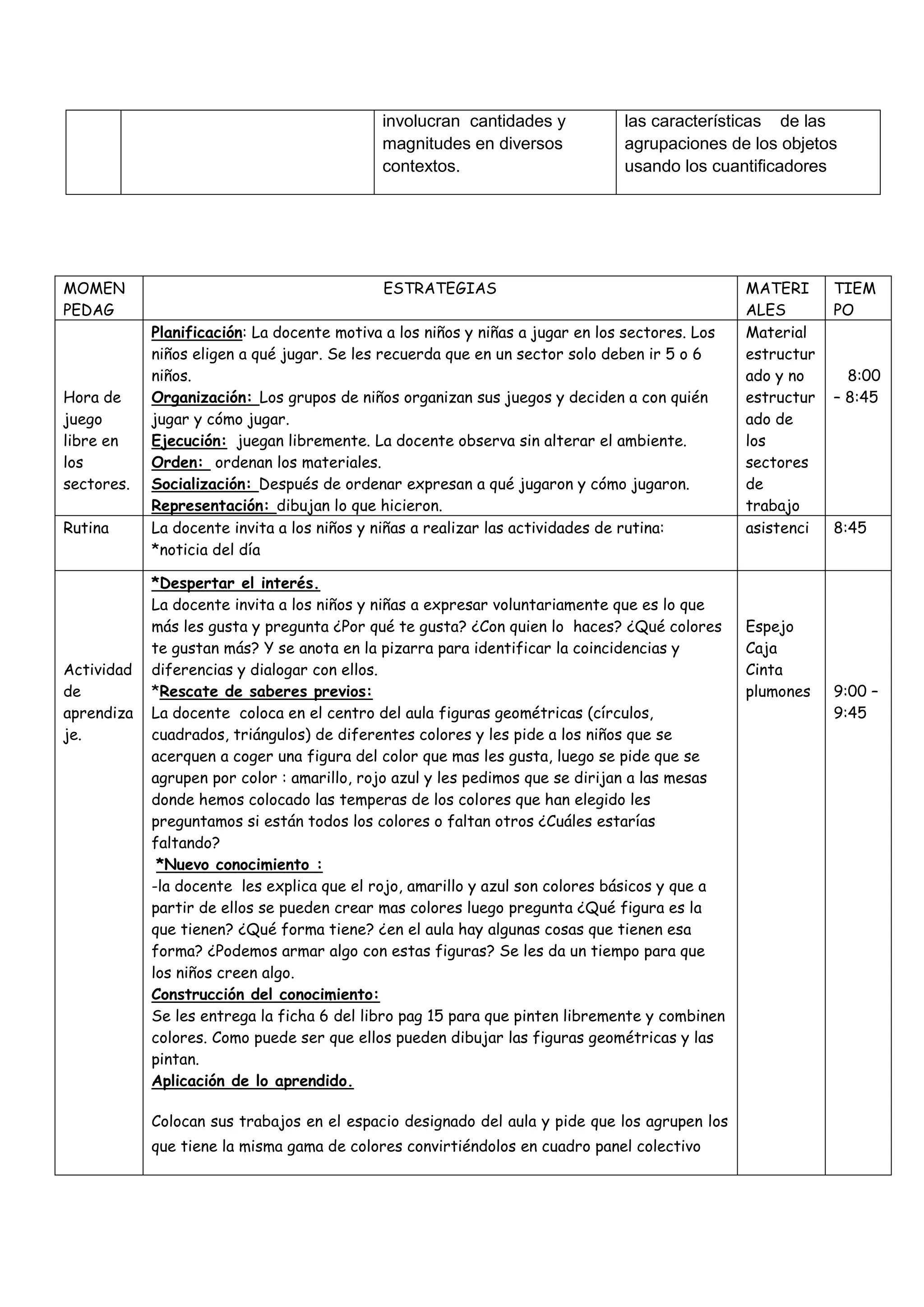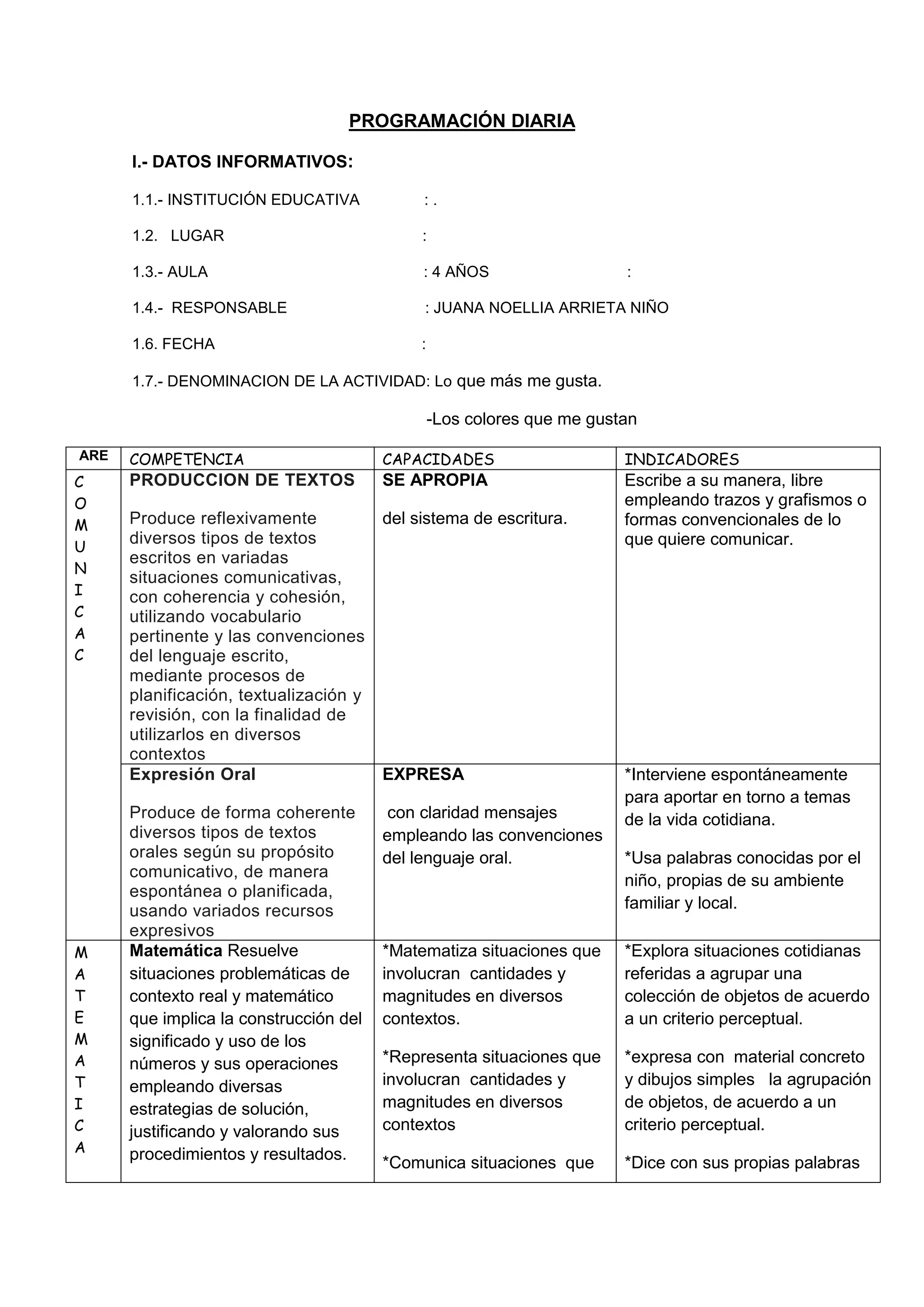 El documento presenta la programación diaria de una clase para niños de 4 años. La jornada incluye tiempo de juego libre, rutinas, una actividad sobre colores favoritos, psicomotricidad, lectura de un cuento, arte y música para la salida. El objetivo es desarrollar las habilidades comunicativas, matemáticas y artísticas de los niños.