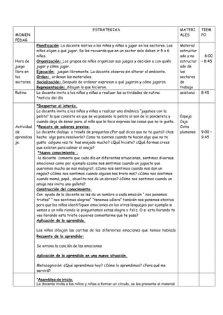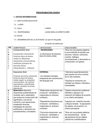 El documento presenta la programación diaria de una clase para niños de 4 años. La jornada incluye tiempo de juego libre, rutinas, una actividad sobre emociones, psicomotricidad, lectura de un cuento, arte y música. La docente guía a los niños a través de estas actividades usando estrategias como el diálogo y la motivación, con el objetivo de desarrollar diferentes habilidades en los niños.