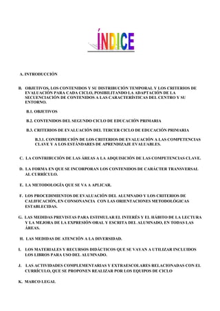 Este documento presenta la programación didáctica del tercer ciclo de educación primaria de un colegio. Describe los objetivos y contenidos de las diferentes áreas curriculares como lengua castellana, matemáticas, ciencias naturales y sociales. Explica cómo cada área contribuye al desarrollo de las competencias clave y la metodología a aplicar, los criterios de evaluación, y las medidas de atención a la diversidad. Además, incluye el horario lectivo distribuido por asignaturas y el marco legal en