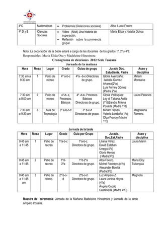 El documento presenta el cronograma de las elecciones que se llevarán a cabo en la sede Toscana. La jornada contará con dos sesiones, una por la mañana de 7:00 am a 10:00 am y otra por la tarde de 10:15 am a 1:00 pm. Durante las sesiones, los diferentes grados participarán en actividades pedagógicas, cívicas y culturales relacionadas con la democracia y las elecciones mientras votan por mesa en el patio de recreo o el aula de tecnología. Los resultados se comunicarán