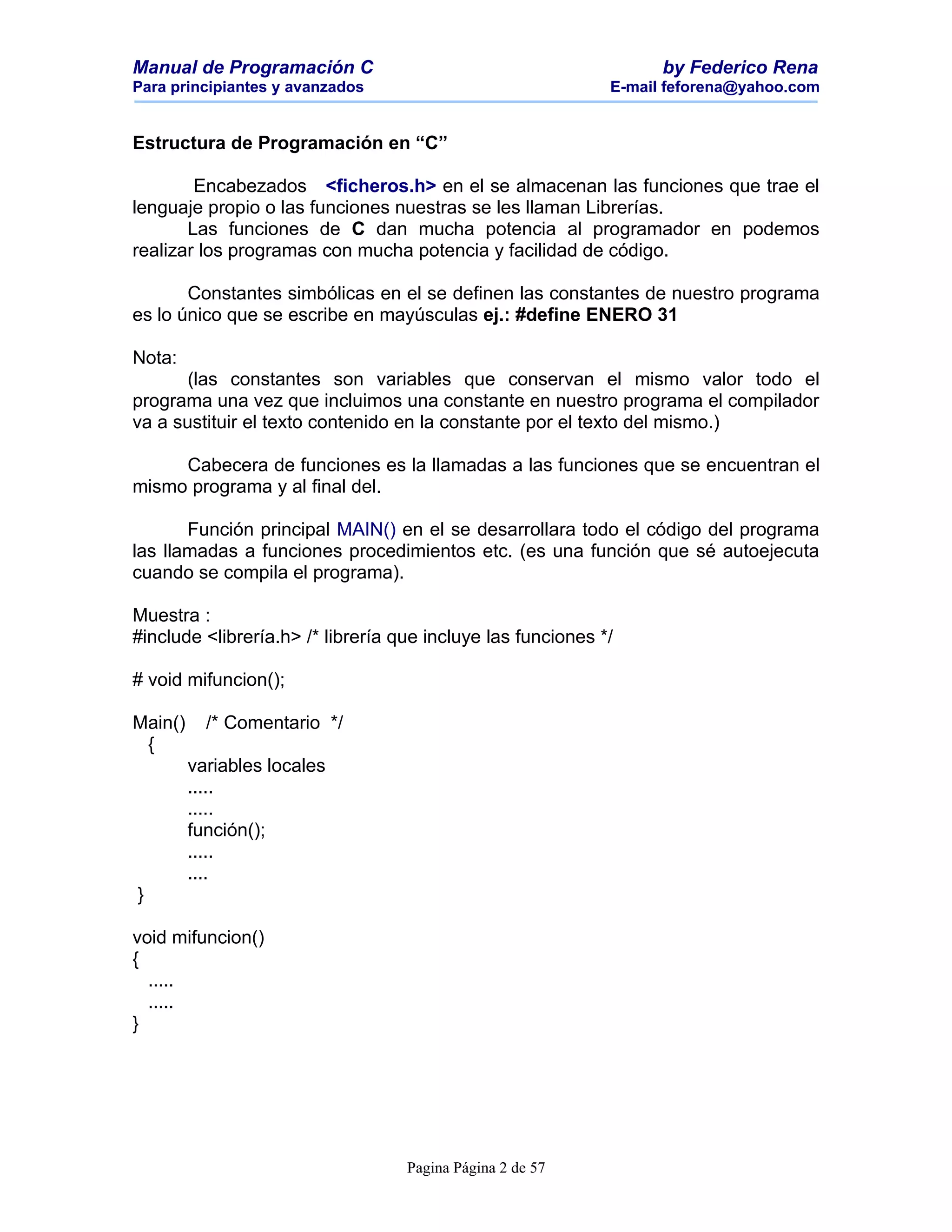 Este documento presenta una introducción al lenguaje de programación C dirigida a principiantes y avanzados. Explica la estructura básica de un programa en C, incluyendo la función principal, librerías, comentarios, variables, constantes y cadenas de texto. También cubre temas como la definición y uso de variables, incrementos y decrementos, y muestra ejemplos simples de programas en C.