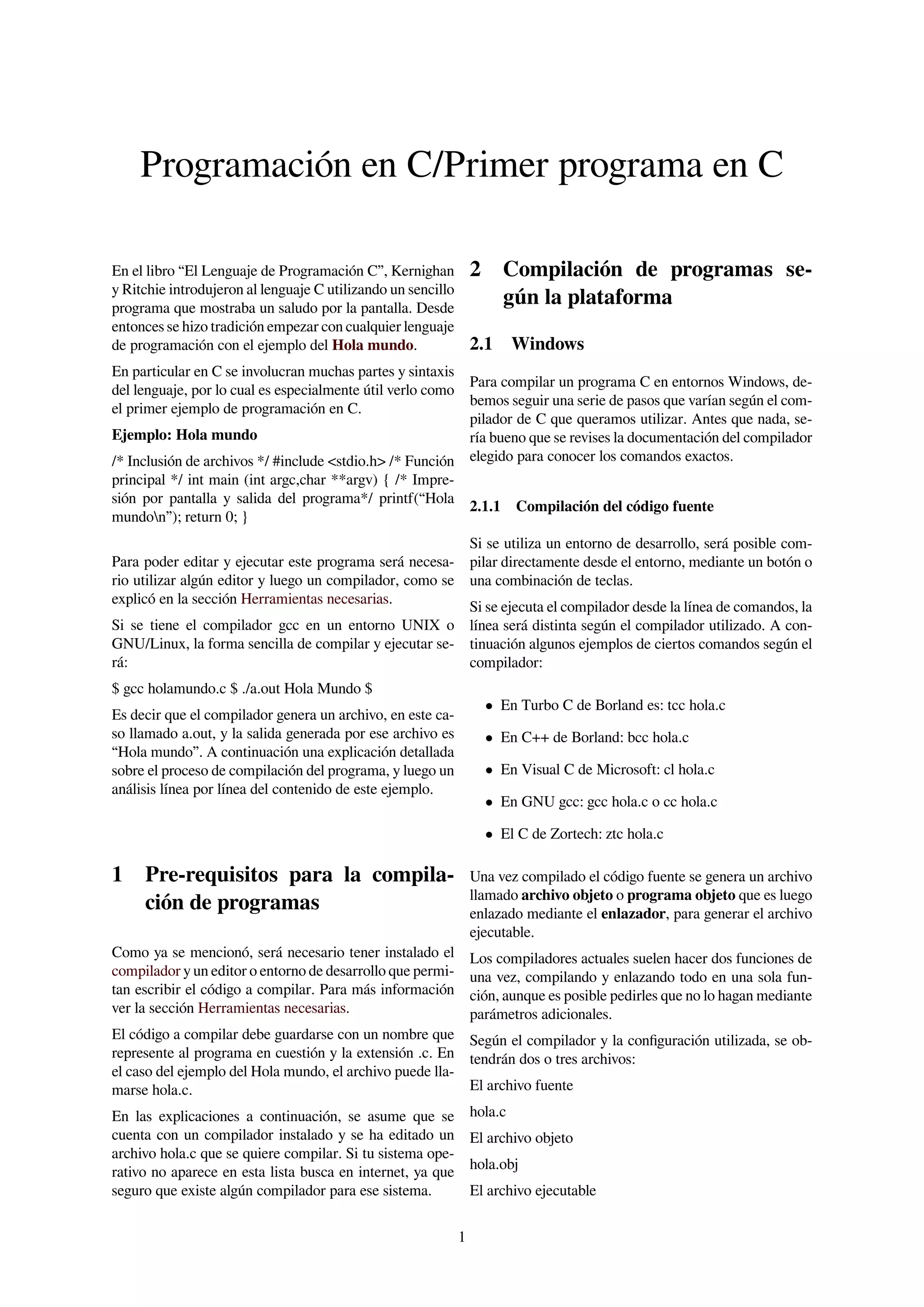 El documento explica los pasos para crear un programa "Hola Mundo" en C. Describe la estructura básica de un programa en C, incluyendo la función main que contiene las instrucciones del programa, y la línea #include que permite utilizar funciones como printf. Explica cómo compilar y ejecutar el programa en diferentes sistemas operativos como Windows, Linux y GNU.