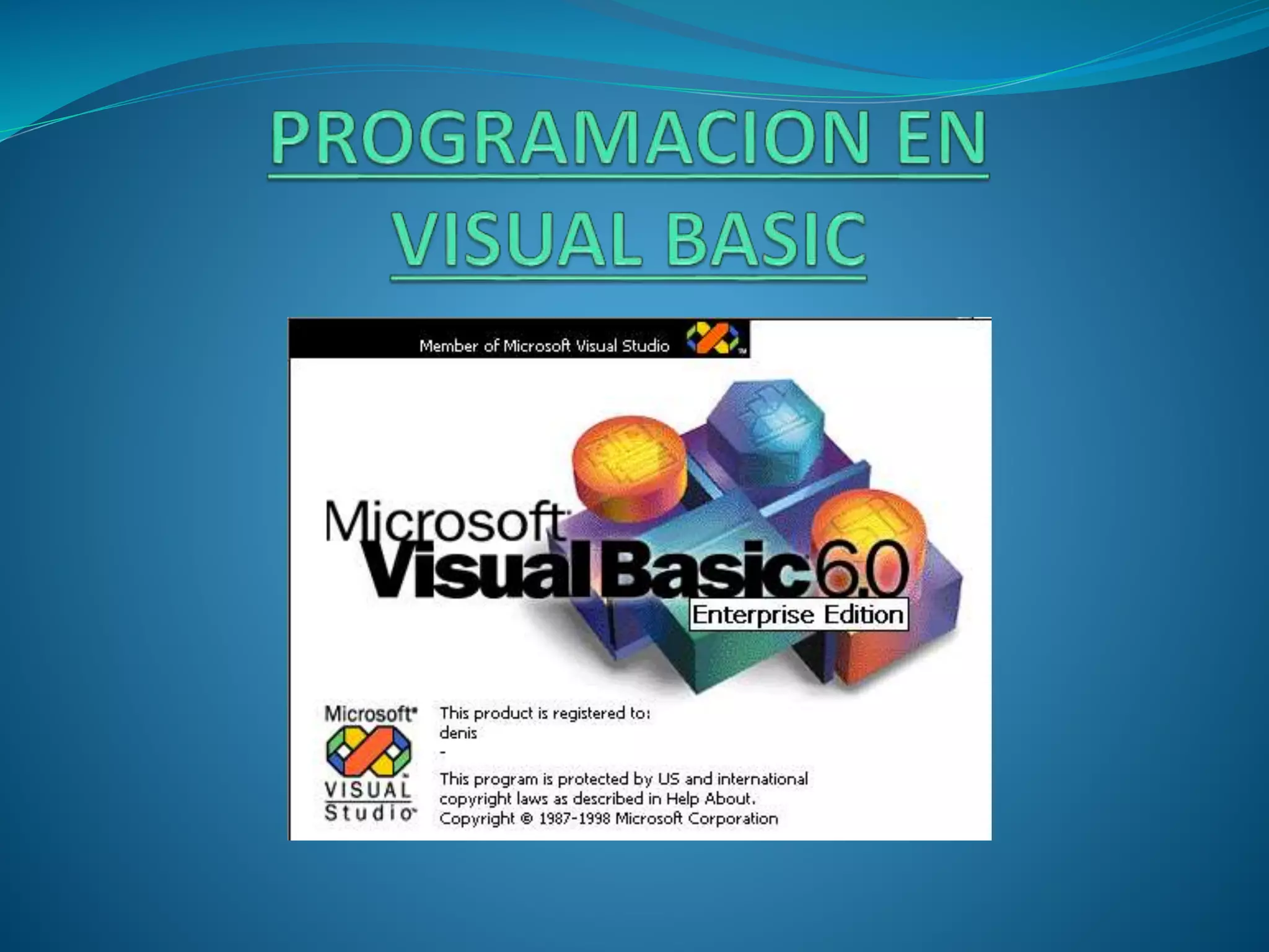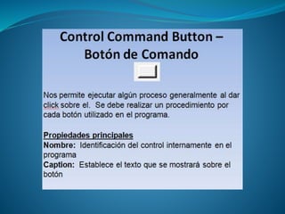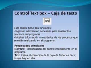 Visual Basic 6.0 permite crear programas para Windows utilizando varios elementos de interfaz como ventanas, botones, cuadros de diálogo y texto. El documento describe los principales controles en Visual Basic como botones de comando, etiquetas, cajas de texto y botones de opción. También explica que la interfaz es la pantalla que ve el usuario y que está compuesta por un formulario y controles.