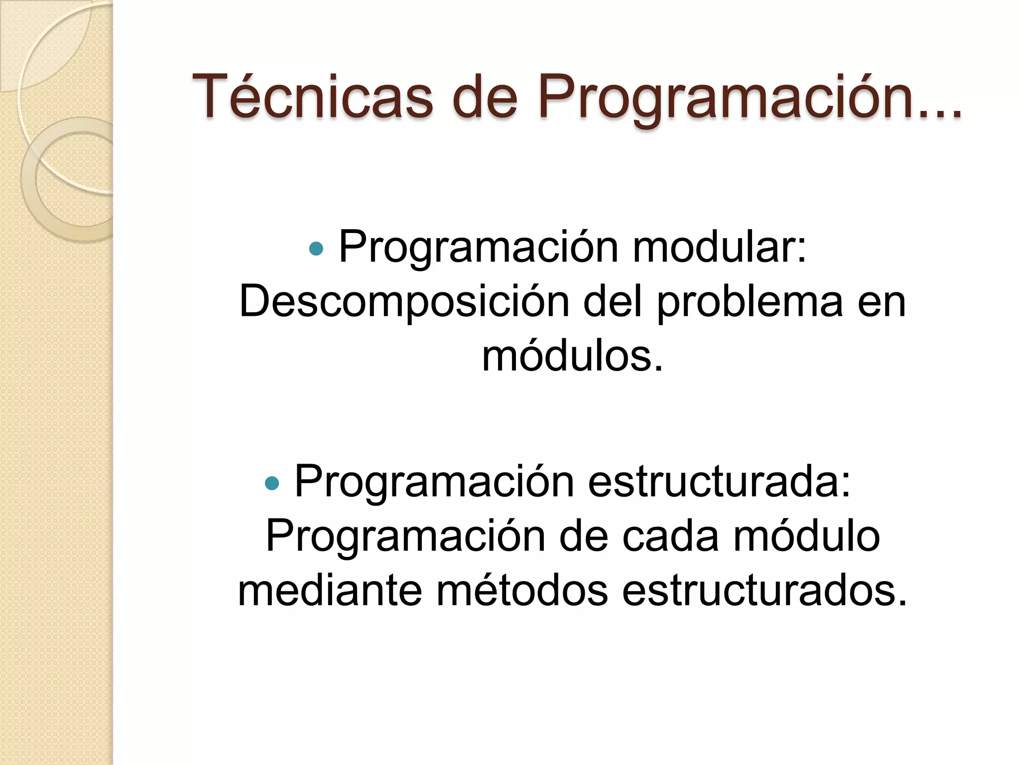 Este documento describe las técnicas de programación estructurada y modular. Explica que la programación modular implica descomponer un problema en módulos, y la programación estructurada significa programar cada módulo usando métodos estructurados como secuenciales, selectivos y repetitivos. También detalla que la programación estructurada reduce el tiempo necesario para escribir, probar y mantener programas mediante el uso de recursos abstractos, diseño descendente y estructuras básicas.