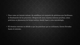 Extreme Programming (XP) es una metodología ágil que se enfoca en satisfacer las necesidades del cliente, mejorar la productividad y comunicación del equipo. XP propone cuatro valores fundamentales: comunicación, simplicidad, retroalimentación y valentía. El proceso de XP incluye fases de exploración, planificación, iteraciones, producción, mantenimiento y cierre del proyecto.