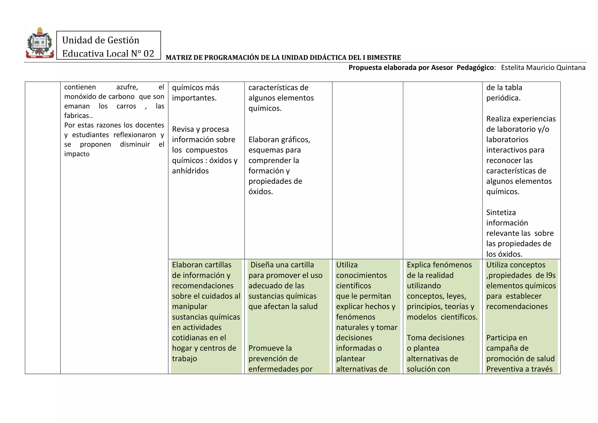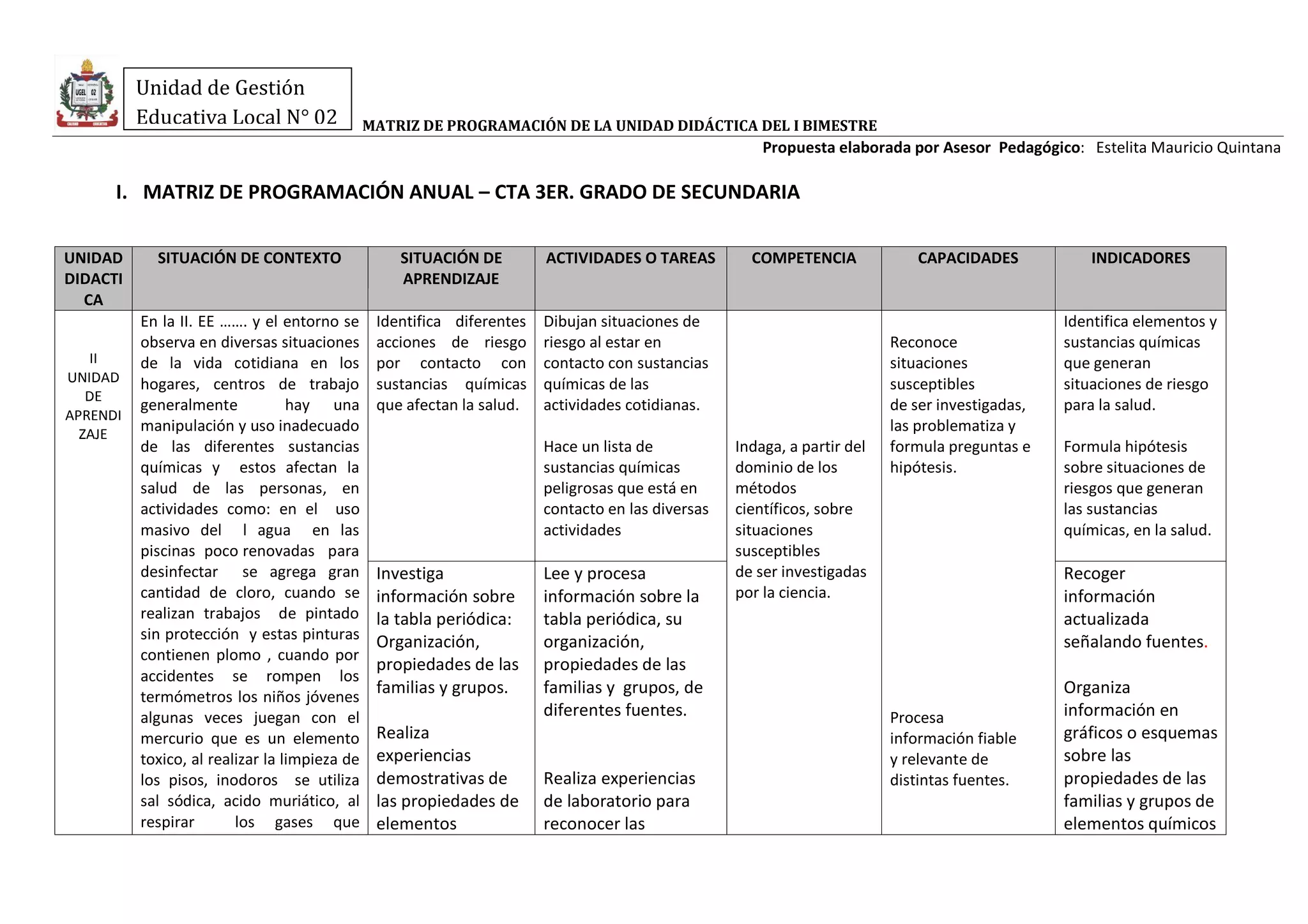 Este documento presenta una propuesta de matriz de programación para la unidad didáctica del primer bimestre de tercer grado de secundaria. La unidad se centra en identificar elementos y sustancias químicas de uso cotidiano que pueden generar riesgos para la salud si son manipulados de forma inadecuada. Los estudiantes investigarán estas sustancias, sus propiedades y efectos, y diseñarán una cartilla de prevención para promover un uso seguro de las mismas. La evaluación incluirá listas de elementos, esquemas con inform