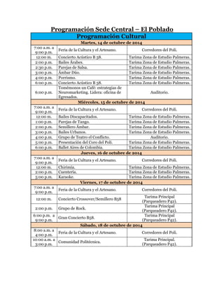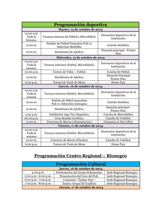 El documento detalla la programación de eventos culturales y deportivos en una sede educativa del 14 al 18 de octubre de 2014, incluyendo ferias, conciertos, presentaciones artísticas y competiciones deportivas. Destacan actividades como el festival gastronómico, torneos de fútbol y microfútbol, y presentaciones de grupos musicales y teatrales. La programación incluye tanto actividades recreativas como educativas en diversas sedes, promoviendo la interacción cultural y deportiva entre los participantes.