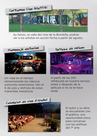Este documento presenta la programación de cine de verano en un autocine al aire libre en la Bombilla de Madrid, con películas proyectadas desde el 23 de junio hasta el 9 de septiembre de 2017. Incluye información sobre la venta de entradas, horarios de proyección, precios y cómo llegar al lugar. También anuncia eventos especiales como coloquios sobre películas y el cine graffiti.