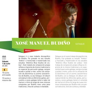 El documento anuncia varios eventos culturales que tendrán lugar en el mes de junio, incluyendo conciertos musicales, obras de teatro y comedia. Se presenta el nuevo disco de Xosé Manuel Budiño titulado "Sotaque" y un concierto de la banda Amesmalúa. También se anuncia el espectáculo de humor de Roberto Vilar "A cabeza non para" y la obra de teatro "Villa Puccini".