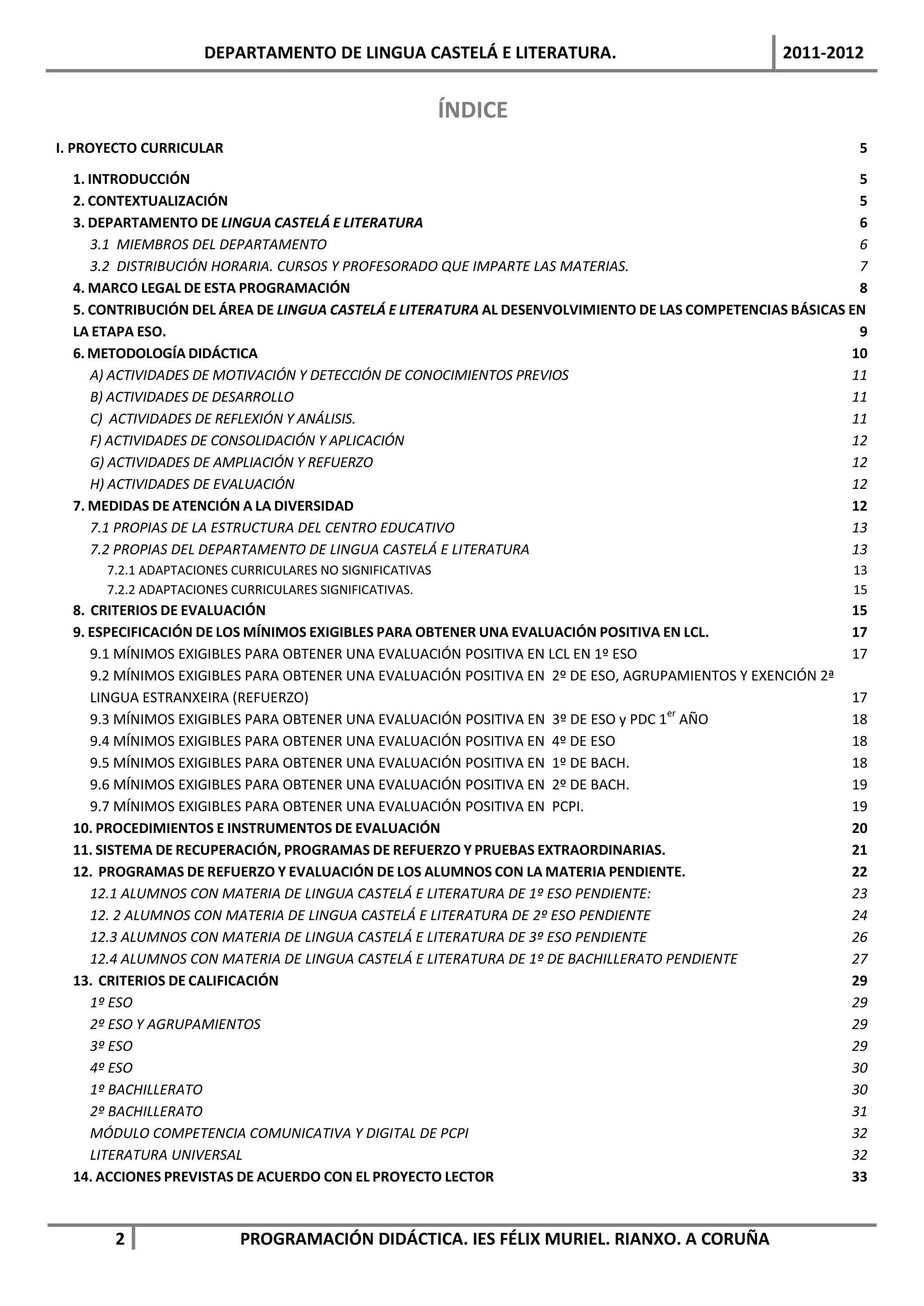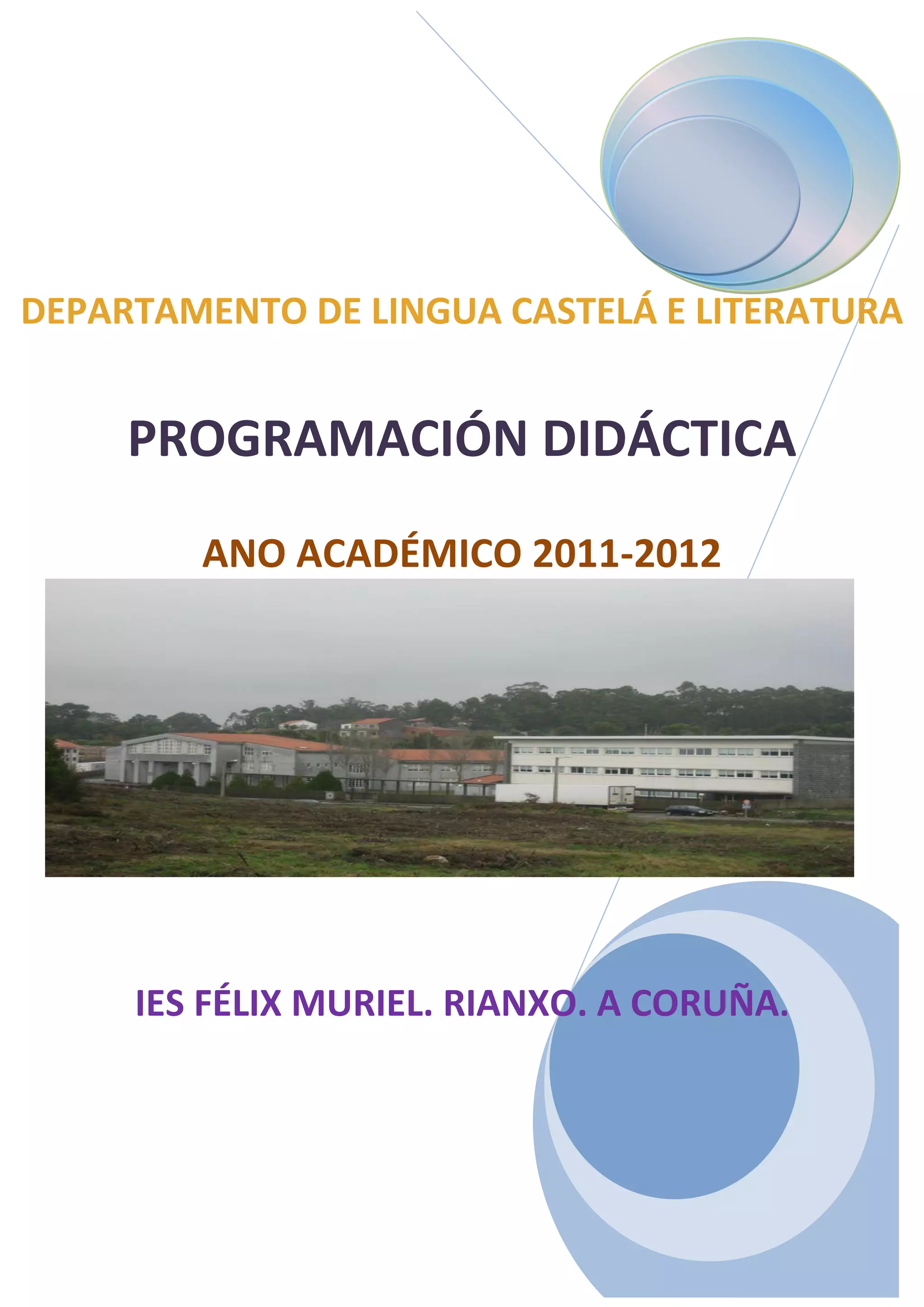 Este documento presenta la programación didáctica del departamento de lengua castellana y literatura del IES Félix Muriel para el curso académico 2011-2012. Incluye los objetivos generales de la etapa de educación secundaria obligatoria y del área, los contenidos y unidades didácticas para cada curso, así como los criterios de evaluación. Además, describe las medidas de atención a la diversidad, los recursos disponibles y las actividades complementarias previstas para el curso.