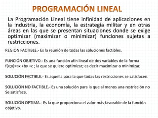 Este documento describe un problema de programación lineal para minimizar los costos de operación de una aerolínea al transportar pasajeros en diferentes clases usando dos tipos de aviones. Se establecen restricciones sobre la capacidad de pasajeros y el costo por milla de cada avión. La solución óptima minimiza la función objetivo de costos totales utilizando una combinación de 37.5 aviones del tipo P-1 y 25 aviones del tipo P-2.