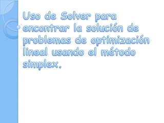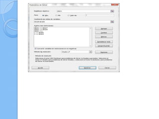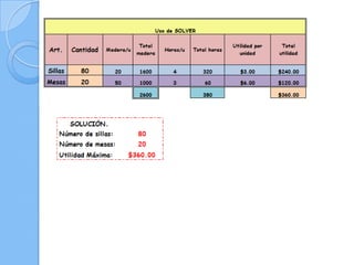 Este documento presenta los resultados de dos problemas resueltos con la herramienta solver de Excel: 1) un problema de ejemplo con mesas y sillas tomado de una presentación sobre programación lineal, y 2) un problema propuesto para minimizar los días de producción de dos fábricas que fabrican tres tipos de hornos.