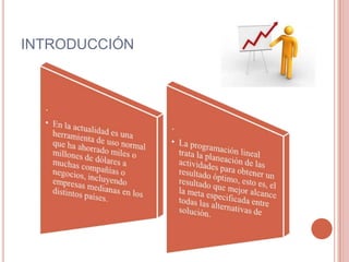La programación lineal es un procedimiento matemático para resolver problemas indeterminados formulados como un sistema de inecuaciones lineales. El objetivo es maximizar una función objetivo que determina el rendimiento, sujeto a ciertas restricciones o condiciones. Se representan las restricciones como rectas auxiliares para obtener la región factible de puntos solución, y así encontrar la distribución óptima de recursos que maximice el interés o minimice los costes.