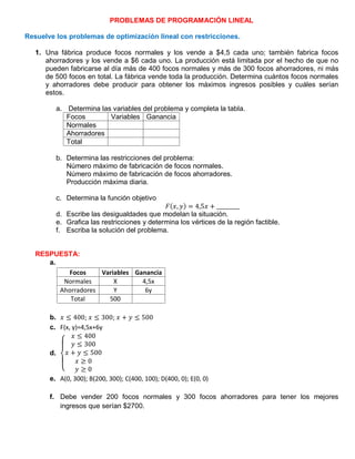 1. Una fábrica produce focos normales y los vende a $4,5 cada uno; también fabrica focos