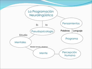 La Programación Neurolingüística (PNL) estudia la mente humana y cómo esta se relaciona con el lenguaje y los patrones de pensamiento. La PNL busca entender cómo se forman los hábitos mentales y cómo estas rutas mentales pueden ser modificadas. Se basa en los modelos de procesamiento de información del cerebro y en cómo el lenguaje, verbal y no verbal, influye en la percepción y comportamiento de las personas.