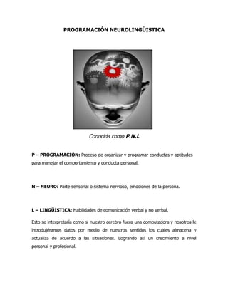 La PNL (Programación Neurolingüística) se refiere al proceso de organizar y programar las conductas y habilidades para manejar el comportamiento y la conducta personal mediante el uso del sistema nervioso, las emociones y la comunicación. El documento luego proporciona 20 consejos de excelencia de Donald Trump para construir el futuro, que incluyen pensar en grande, mantenerse positivo, seguir la pasión, aprender constantemente, seguir la intuición, ser paciente, formar un buen equipo, buscar la belleza, negociar bien, apuntar