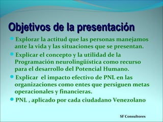 La presentación explora cómo la actitud positiva puede afectar el éxito personal y profesional. También describe cómo la programación neurolingüística (PNL) puede utilizarse para desarrollar el potencial humano al cambiar los patrones de pensamiento limitantes. Finalmente, explica cómo la PNL aplicada en el coaching puede mejorar el desempeño de las organizaciones al empoderar a los empleados.
