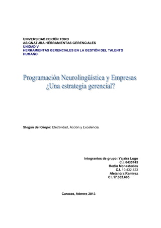 El documento describe una unidad sobre herramientas gerenciales para la gestión del talento humano en la Universidad Fermín Toro, aplicando técnicas de Programación Neurolingüística para mejorar la comunicación y resolución de problemas en el lugar de trabajo. Introduce los objetivos, justificación e introducción de la Programación Neurolingüística y su aplicación en entornos laborales.