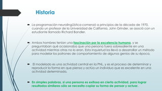 La programación neurolingüística (PNL) comenzó a desarrollarse en la década de 1970 cuando dos hombres estudiaron los patrones de comportamiento de personas exitosas. La PNL explora la relación entre la forma de pensar, comunicarse y los patrones de comportamiento. Se usa para mejorar habilidades como la motivación, comunicación y eliminación de fobias. La PNL puede aplicarse a individuos, grupos y organizaciones en diversos campos como educación, ventas y liderazgo.