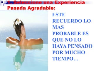 Este documento proporciona instrucciones sobre cómo utilizar técnicas de Programación Neurolingüística para modificar recuerdos agradables y desagradables. Sugiere que al hacer que los recuerdos agradables se vuelvan más brillantes, los sentimientos positivos asociados también se intensifican, mientras que al oscurecer los recuerdos desagradables, los sentimientos negativos asociados disminuyen.