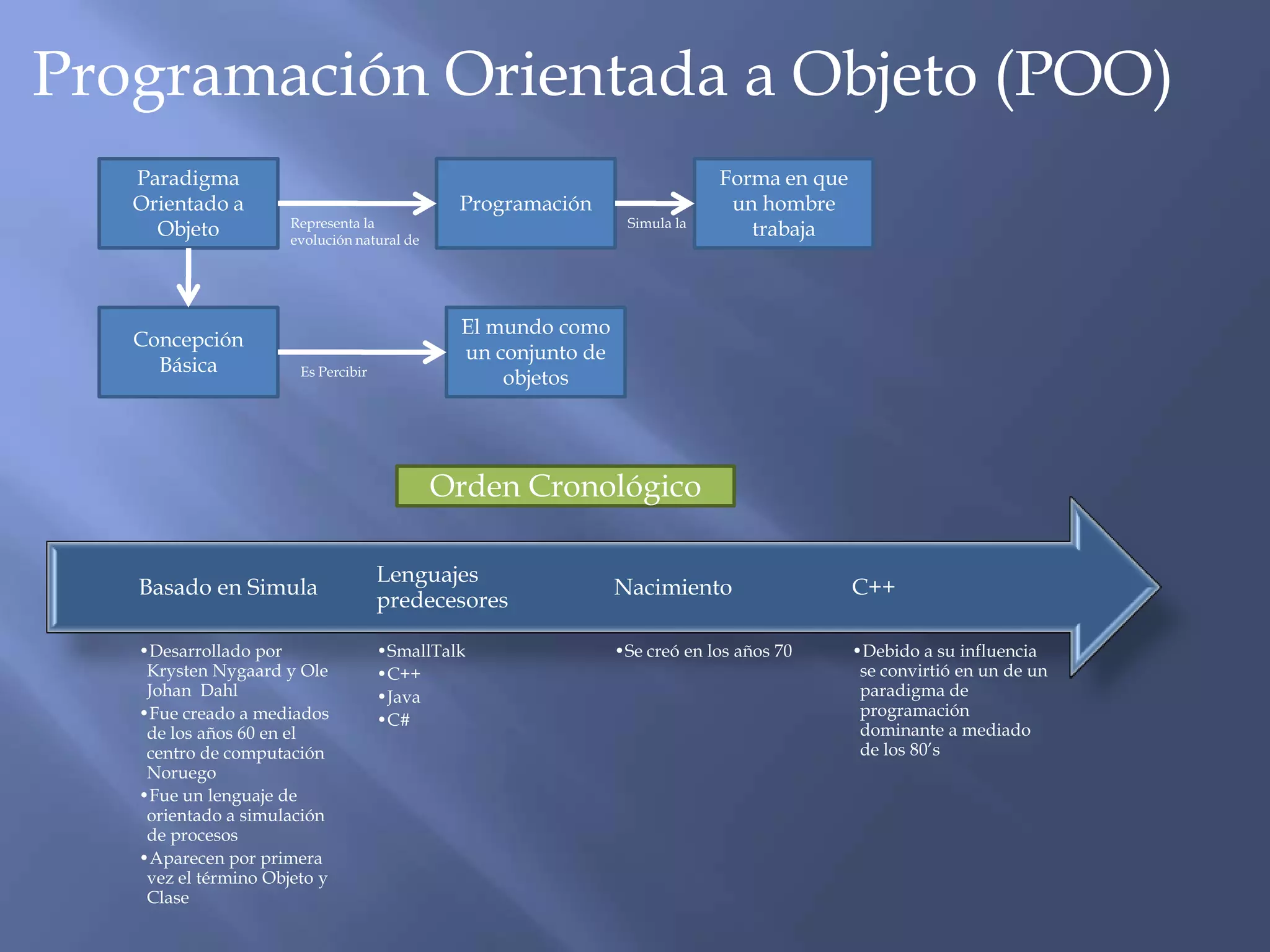 El documento describe los conceptos y características básicas de la Programación Orientada a Objetos (POO). La POO representa la evolución natural de cómo los humanos trabajan y perciben el mundo como un conjunto de objetos. Se basa en principios como la abstracción, encapsulamiento, herencia y polimorfismo.
