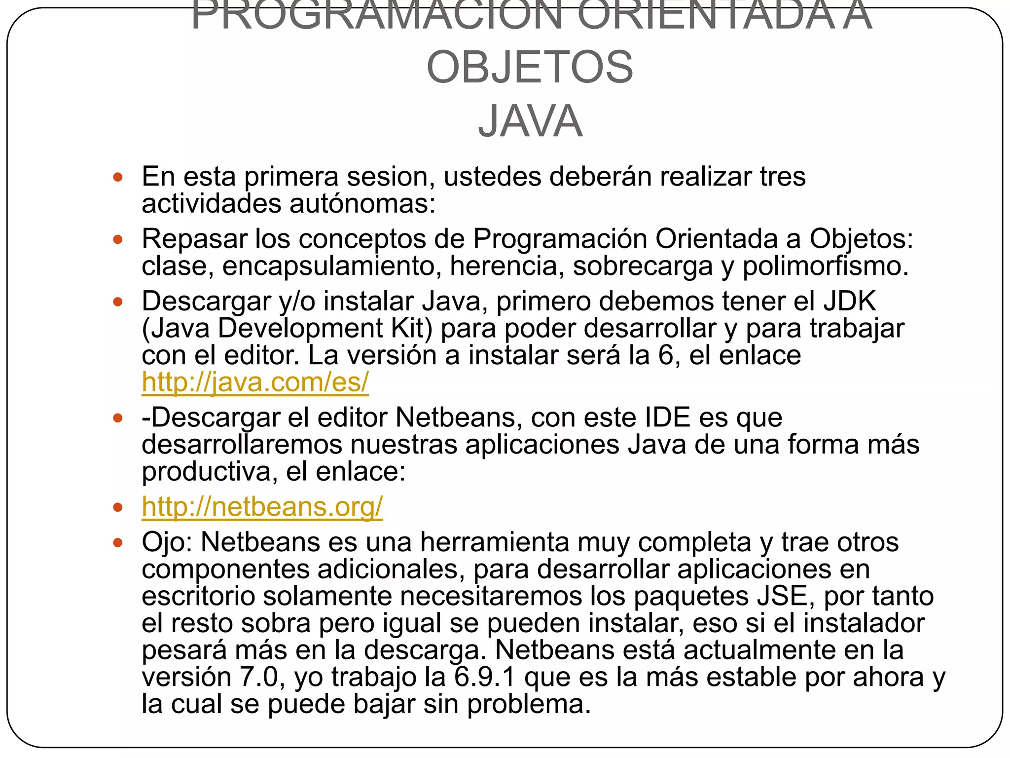 Este documento presenta tres actividades autónomas para una sesión de programación orientada a objetos en Java: repasar conceptos clave como clase, encapsulamiento y herencia; descargar e instalar el JDK de Java versión 6 y el IDE Netbeans; e instalar solo los paquetes JSE de Netbeans para desarrollar aplicaciones de escritorio.
