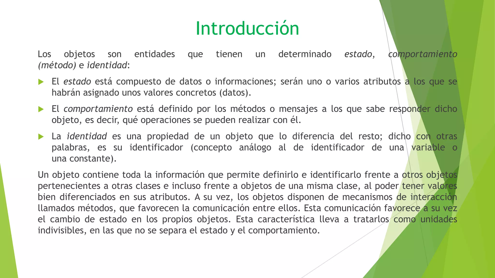 La programación orientada a objetos es un paradigma que utiliza objetos como elementos fundamentales. Un objeto tiene atributos que representan sus características y métodos que representan su comportamiento. Las propiedades y métodos comunes se agrupan en clases, de las cuales los objetos son instancias.