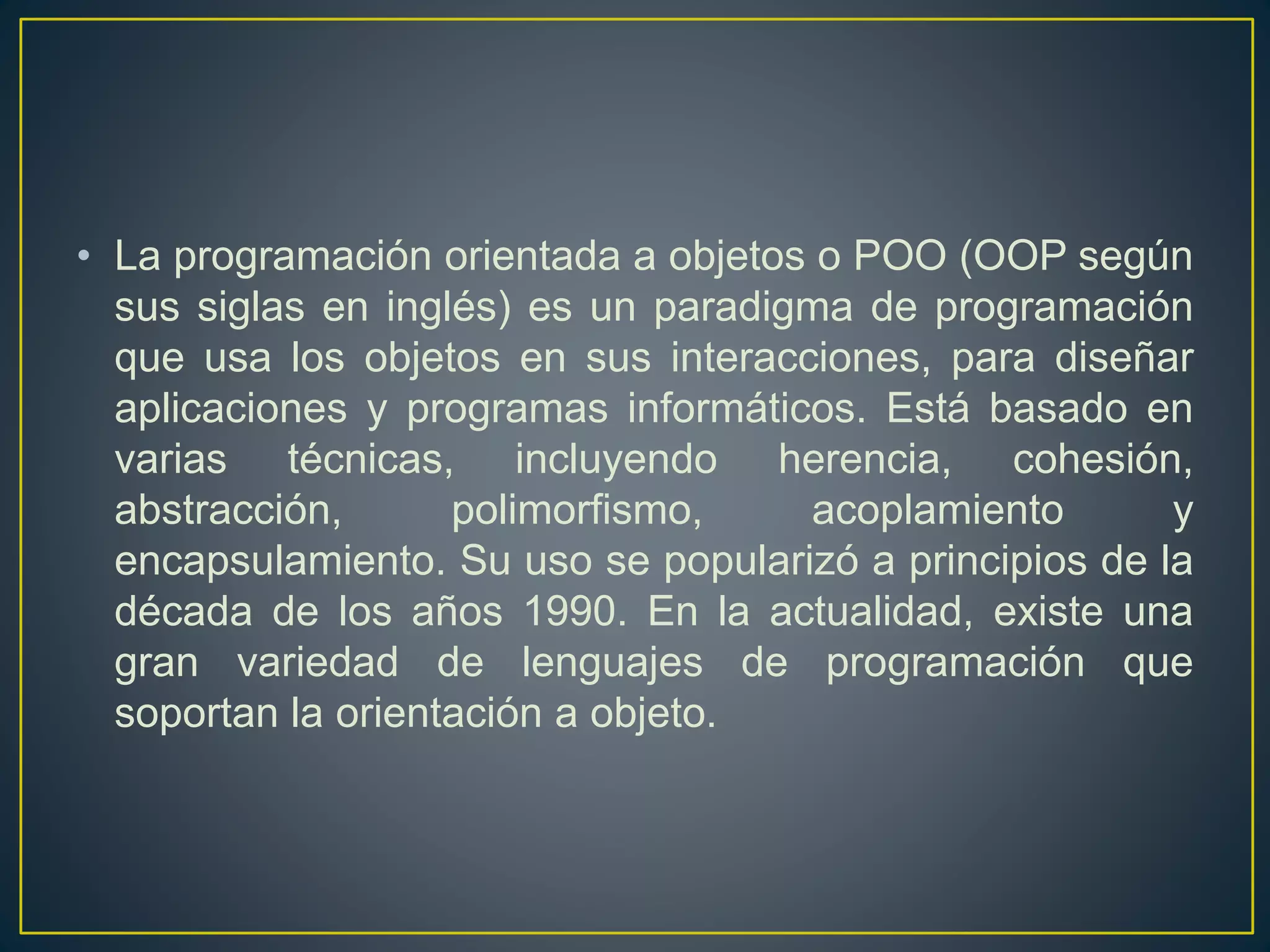 La programación orientada a objetos es un paradigma de programación que usa objetos con estado, comportamiento e identidad. Se basa en conceptos como herencia, encapsulamiento y polimorfismo. Los lenguajes de programación orientados a objetos surgen en la década de 1990 y permiten definir clases de objetos con atributos y métodos.
