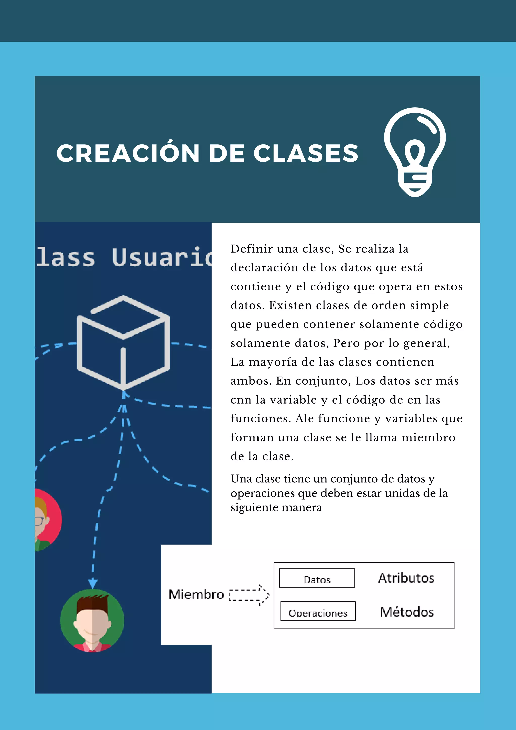 Este documento explica la creación de clases en programación orientada a objetos. Las clases contienen datos y código para operar en esos datos. Se crean clases con la palabra "class" y pueden contener variables y funciones privadas, públicas o protegidas. El ejemplo crea una clase Persona con propiedades nombre (privada) y edad (pública) para almacenar datos de una persona.