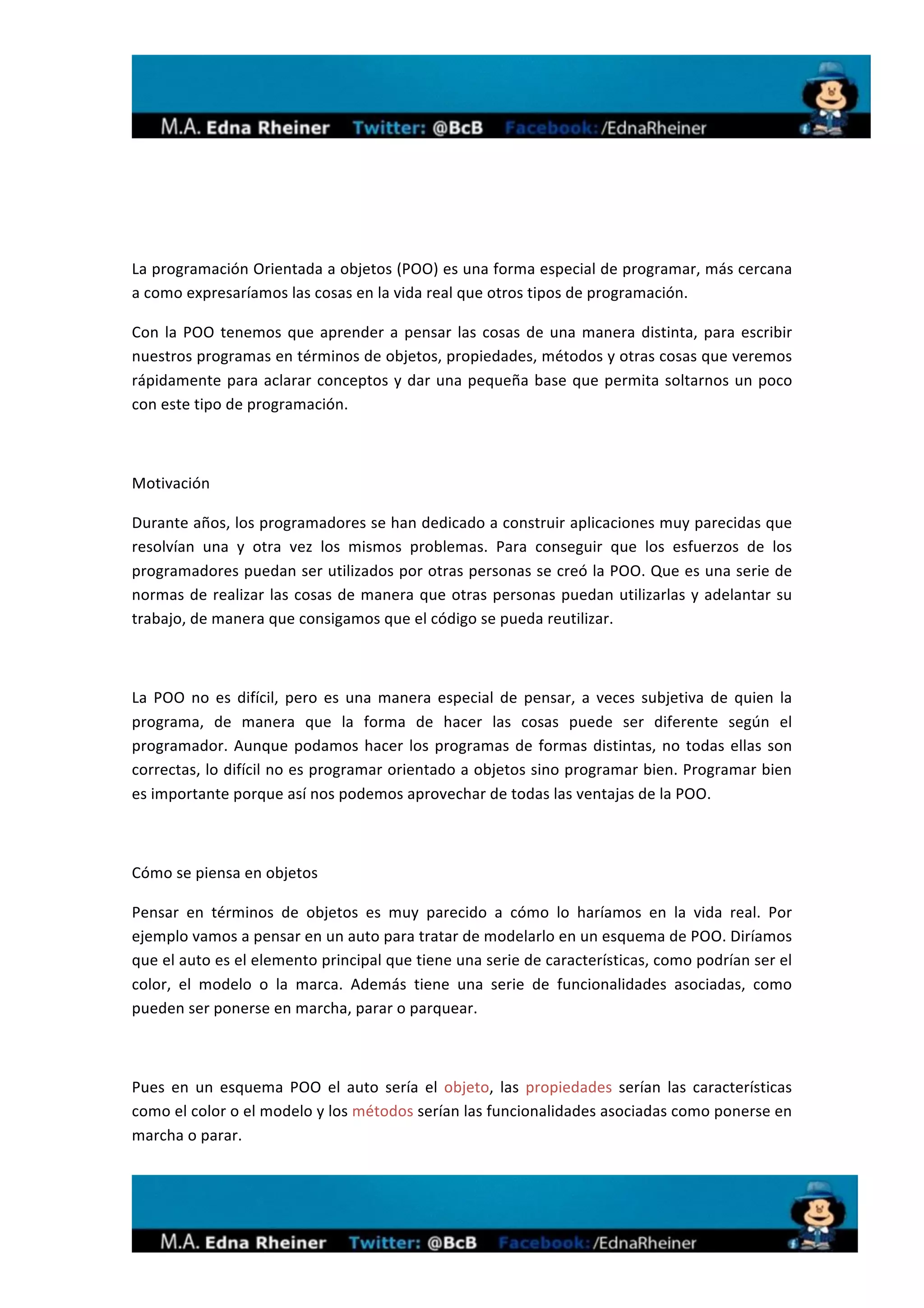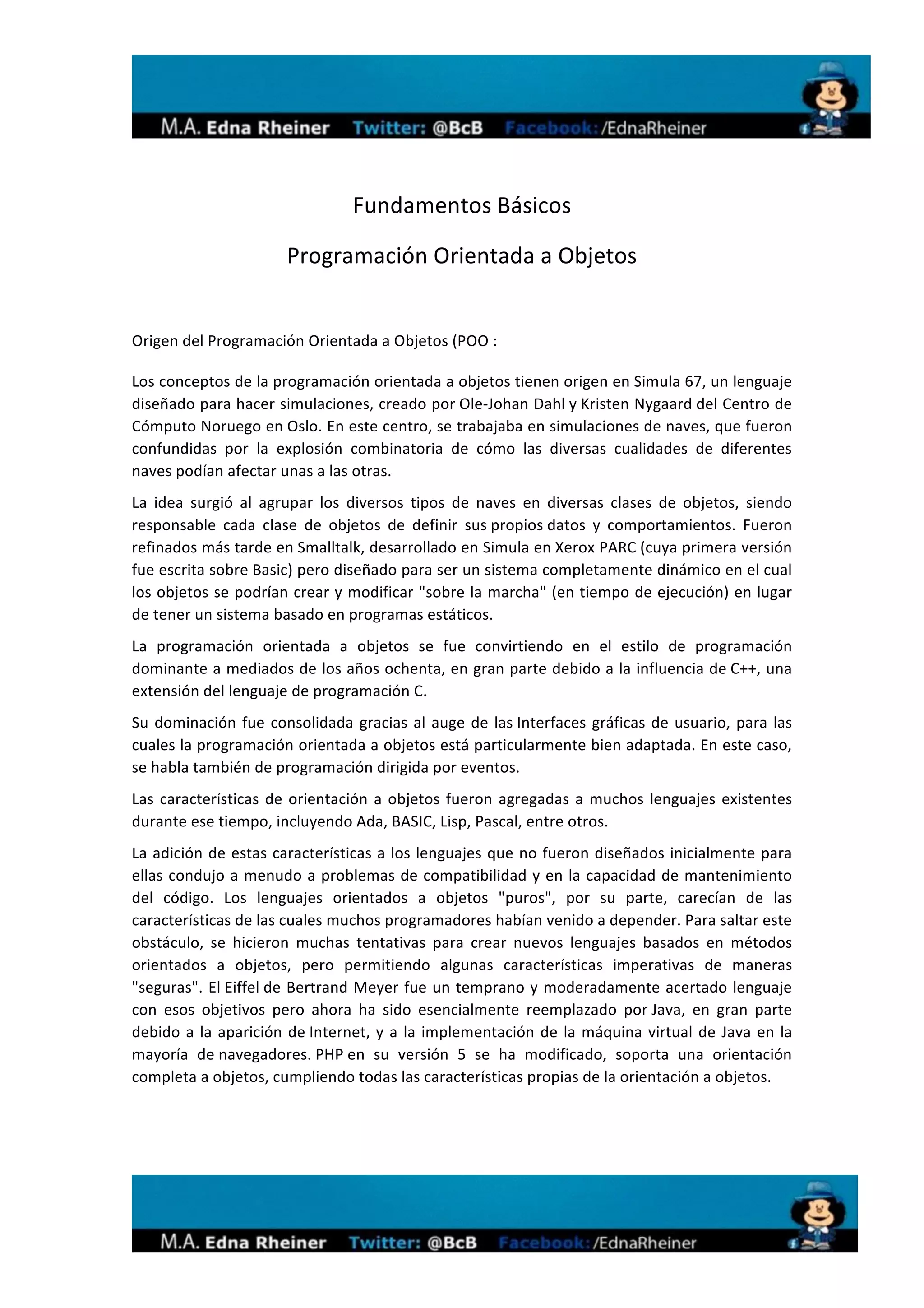 El documento describe los orígenes y evolución de la programación orientada a objetos. 1) Simula 67 fue el primer lenguaje orientado a objetos creado para simulaciones. 2) Smalltalk refinó estos conceptos permitiendo modificar objetos en tiempo de ejecución. 3) A mediados de los 80s, C++ popularizó el estilo orientado a objetos al agregar estas características a C.