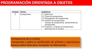 El documento aborda el manejo de excepciones en C++, explicando su clasificación y el uso de las palabras clave try, catch y throw para gestionar errores en tiempo de ejecución. Se presentan ejemplos de excepciones predefinidas y cómo lanzarlas en el contexto de la programación orientada a objetos. Además, se incluyen ejercicios prácticos para aplicar los conceptos aprendidos en situaciones reales.