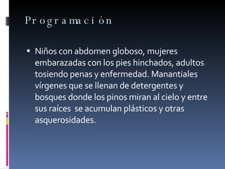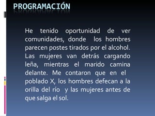 El documento describe las condiciones de pobreza y falta de salud que existen en algunas comunidades, incluyendo niños desnutridos, mujeres embarazadas con problemas de salud y contaminación de fuentes de agua. También narra la historia de un joven médico que intentó implementar varios programas de salud comunitaria pero que no tuvieron éxito debido a la falta de participación y compromiso de la comunidad. Se enfatiza la importancia de la planeación para el éxito de cualquier iniciativa.