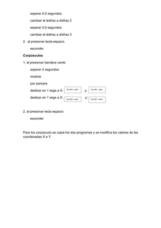 Este documento describe los pasos para crear varias simulaciones en Scratch, incluyendo una vela, llama, globos y corpúsculos. Para cada simulación, explica las acciones que ocurren cuando se presiona la bandera verde y la tecla espacio, como mostrar, esconder, cambiar efectos de color y disfraces, y mover objetos a diferentes coordenadas X e Y.
