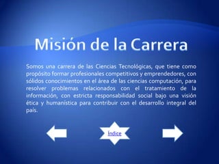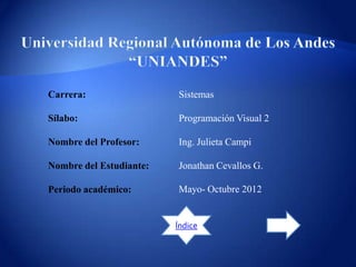 Este documento presenta el sílabo del curso de Programación Visual 2 impartido por la Ing. Julieta Campi en la carrera de Sistemas durante el período de Mayo a Octubre de 2012, e incluye la misión y visión de la carrera, los objetivos educativos, mecanismos de evaluación y tareas del semestre.