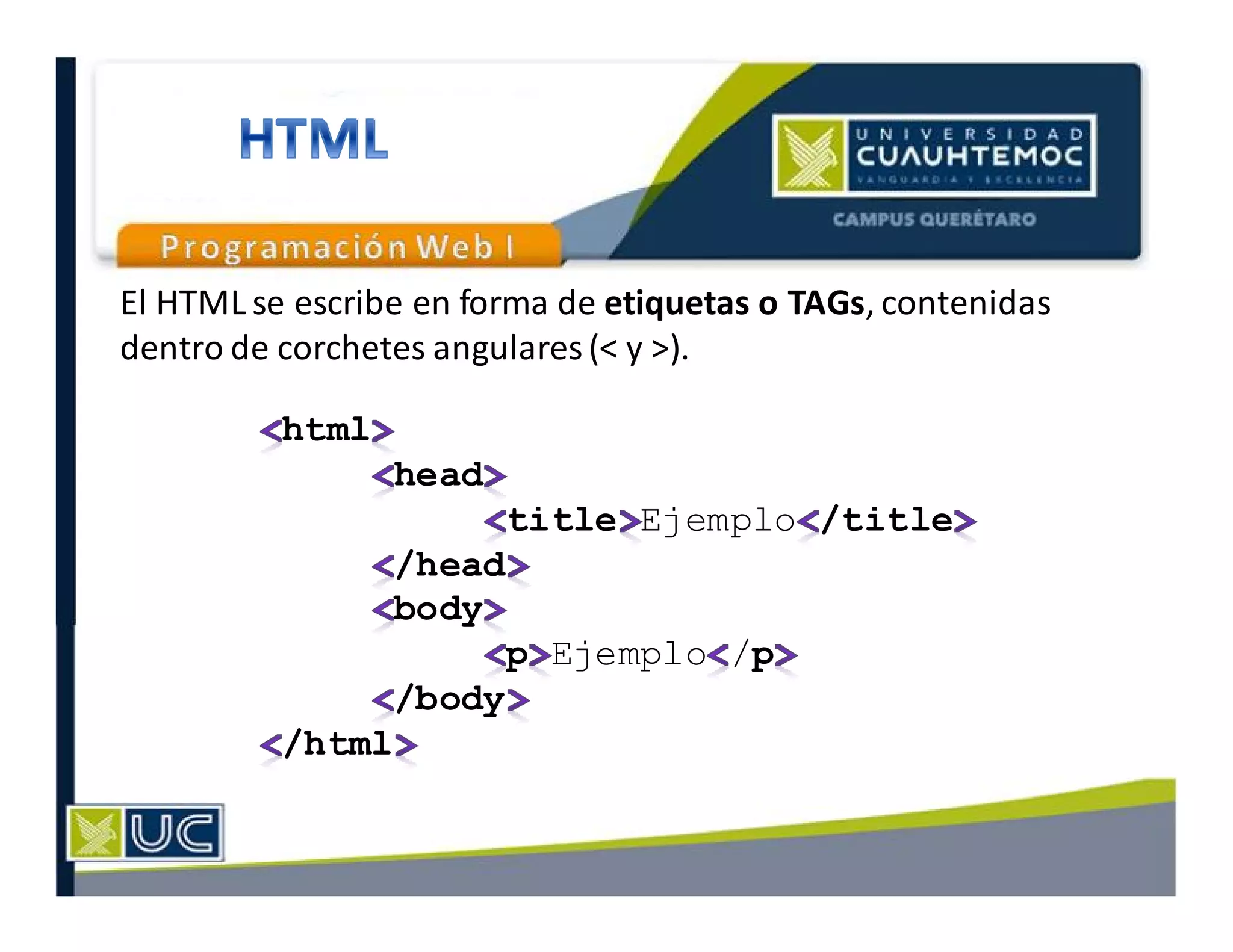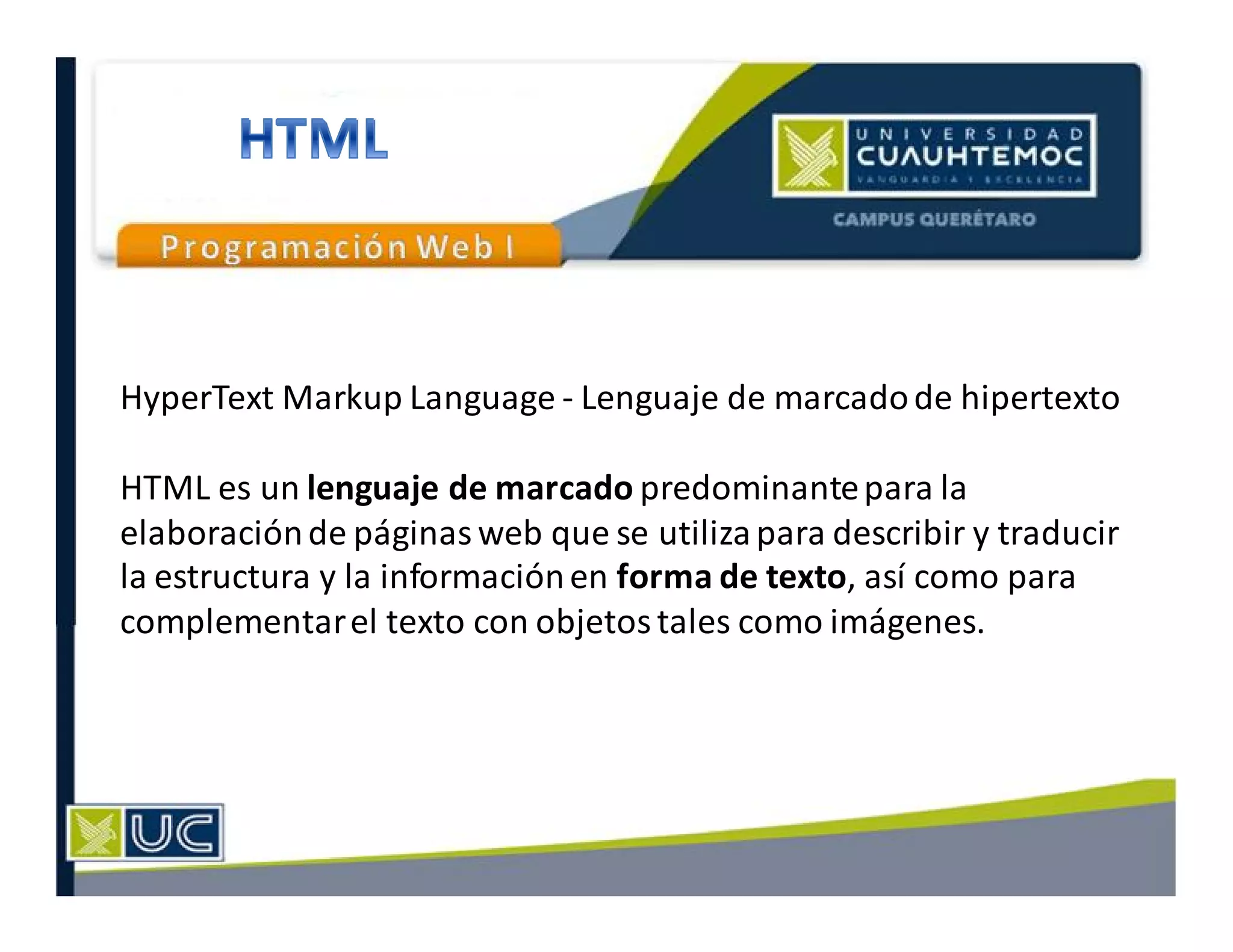 HTML es un lenguaje de marcado que se utiliza para describir y estructurar páginas web mediante el uso de etiquetas. Estas etiquetas indican elementos como párrafos, encabezados, imágenes, entre otros. El HTML se compone de etiquetas de apertura y cierre que contienen atributos para añadir información adicional.