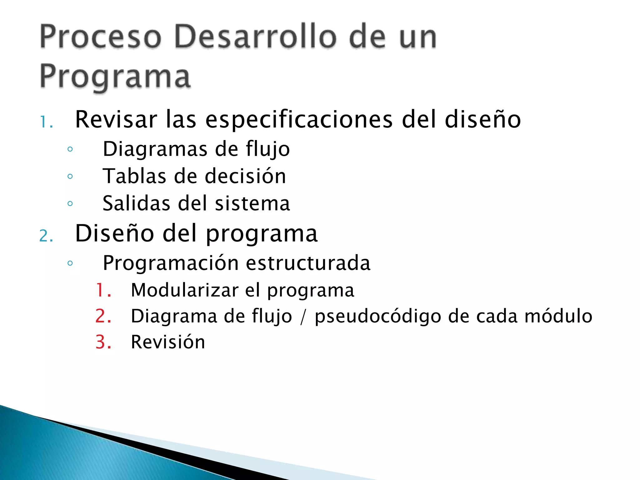 El documento habla sobre el proceso de desarrollo de un programa, incluyendo revisar especificaciones, crear diagramas de flujo y tablas de decisión, diseñar el programa de forma modular, codificar cada módulo, realizar pruebas y documentación, y representar el flujo de datos a través de diagramas, pseudocódigo y algoritmos. También describe la estructura básica de un programa con bloques de declaraciones, instrucciones, entrada y salida de datos, y clasificación de instrucciones.